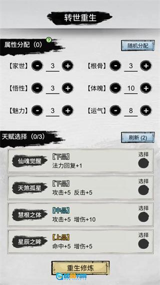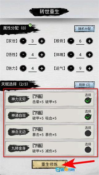 2、在转世重生界面,选择心仪的天赋如神通自现后,点击重生修炼按钮,确定初始属性进入修仙世界。