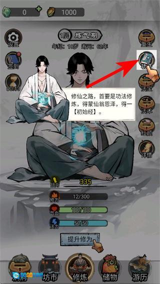 3、进入主界面后,点击右侧的功法按钮,打开功法修炼界面,准备选择修炼的功法。