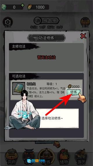 4、在功法修炼界面,点击可选功法如初始经对应的“修炼”按钮,消耗资源开启功法修炼。