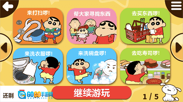 1、无论是小朋友还是大人都超爱的“蜡笔小新小帮手大作战”游戏,能让你在游玩的同时,迎接各种各样有趣的挑战! 2、游戏里可做的事可不少,从“大扫除”“洗衣服”这类家里的小帮手任务,到“购物”“照顾宠物”“捞金鱼”等活动,应有尽有。