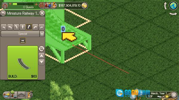 2、进入轨道搭建界面,选择轨道部件如弯道,花费$63放置到对应区域,规划铁路路线。