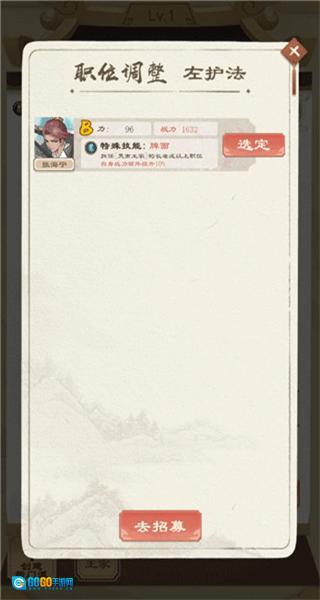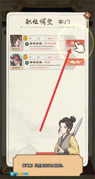 4、在职位调整掌门界面,选择战力最高的角色,点击选定按钮,完成掌门职位的任命,提升门派运营效率。