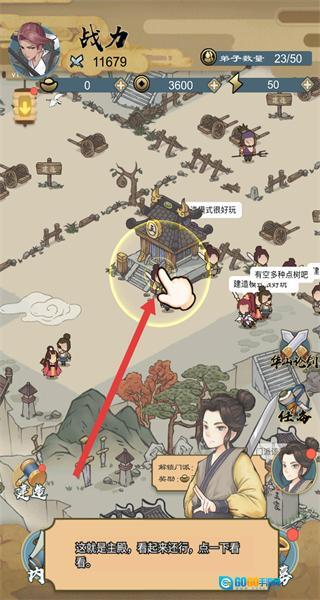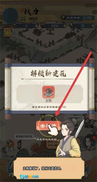 1、进入游戏后解锁主殿,点击去建造按钮,进行主殿的建造,拓展门派的核心建筑设施。