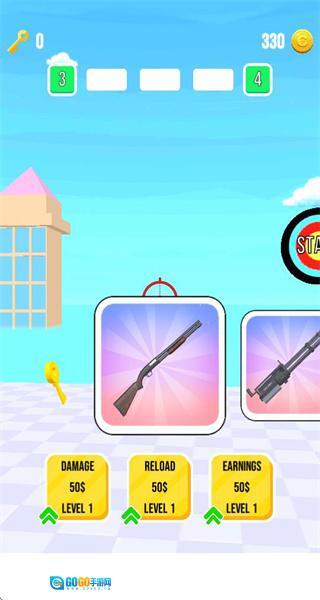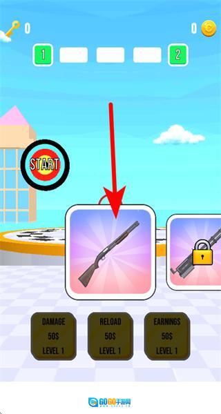 1、进入游戏后,点击初始枪械如猎枪的选项,选定武器进入射击关卡,开启打靶挑战流程。
