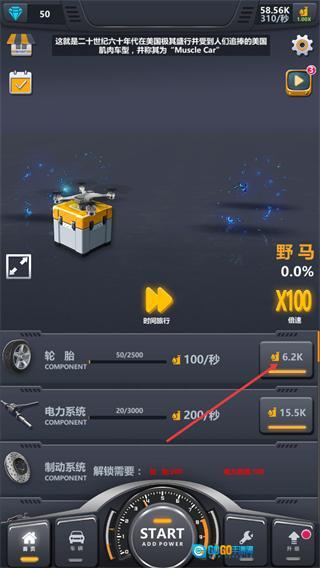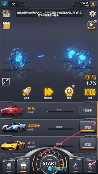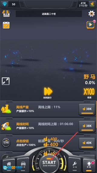 1、在游戏主界面点击START按钮,可增加能量提升产能,同时借助离线产量等加成功能,积累资源推进车辆解锁进度。