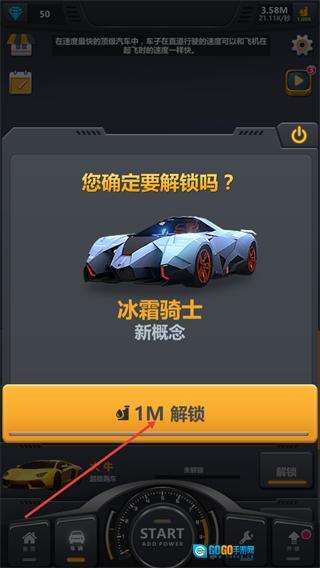 4、在冰霜骑士的解锁确认弹窗中,消耗1M资源点击解锁按钮,即可成功解锁这辆新概念车辆。