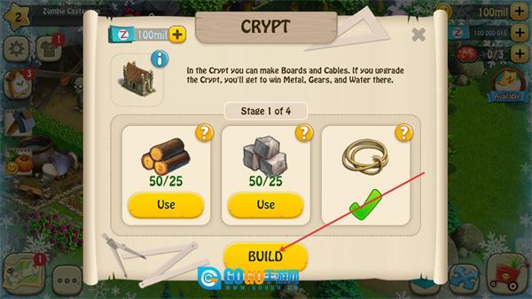 4、放置操作完成后,点击尚未完工的建筑,查看并获取所需的材料,随后点击BUILD按钮来执行建造步骤。