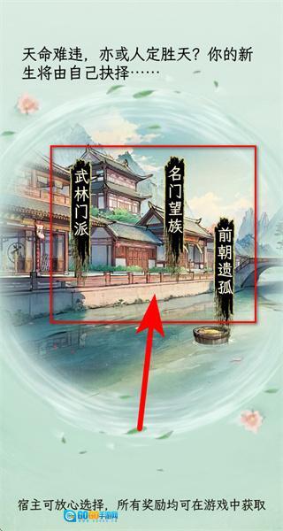 1、进入初始选择界面后,点击目标势力选项如武林门派,选定角色的出身背景,开启剧情流程。