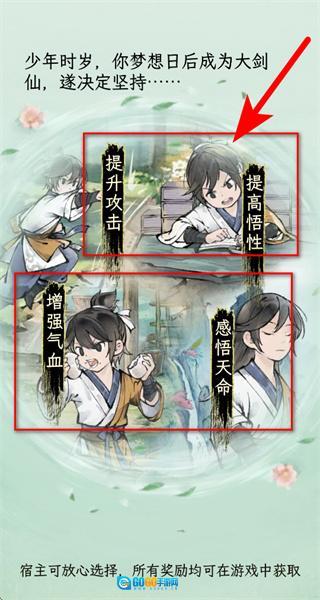 2、在属性成长界面,点击对应选项如提高悟性,为角色选定初始成长方向,奠定属性基础。