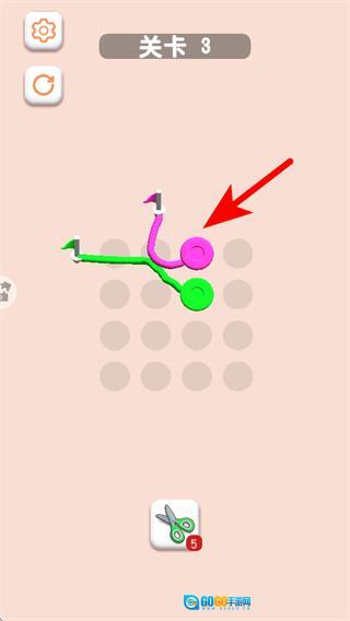 2、进入关卡后,根据箭头指引移动对应颜色的绳圈,将缠绕的绳子整理至对应位置。