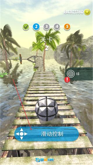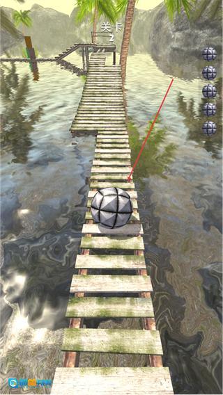 2、操控球体沿木桥路径移动,避开缺口,持续向关卡终点前进。