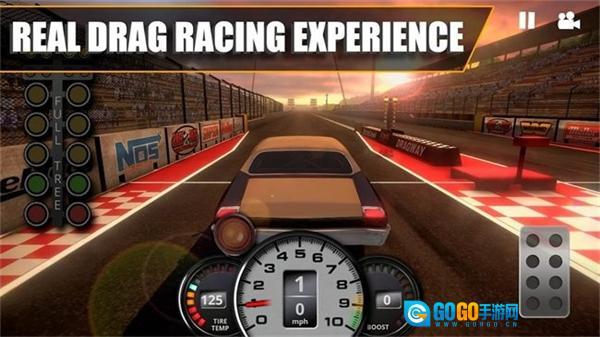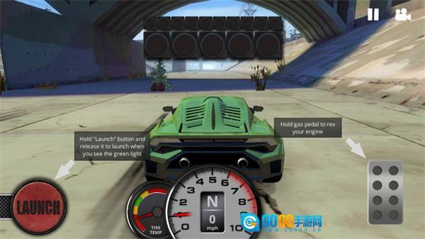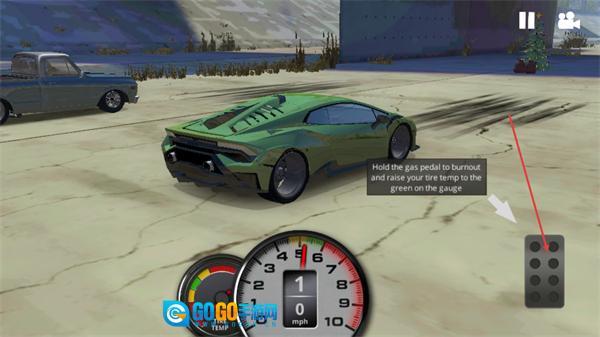 4、进入竞速比赛后,根据游戏中给出的提示,长按油门按钮将轮胎温度提至仪表绿色区。