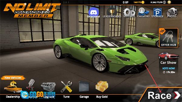2、进入车辆管理界面后,完成车辆相关准备操作,点击右下角的Race按钮,即可进入赛事选择界面参与竞速赛事。