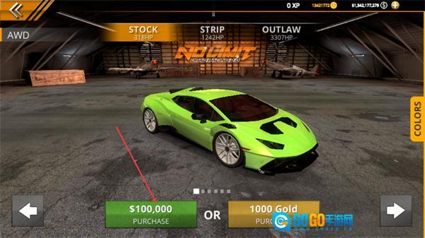 1、这是无极限飙车2的车辆购买界面,选定该绿色跑车后,点击100000PURCHASE按钮,即可消耗对应货币获取该车辆,也可选Gold支付。