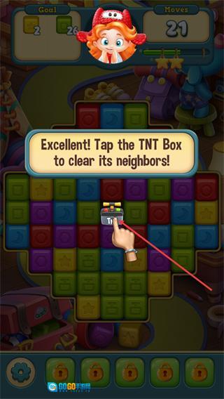 2、游戏中出现Excellent!TaptheTNTBoxtoclearitsneighbors!的提示时,点击界面中的TNT盒子,即可消除其相邻的方块,助力完成Goal中的目标,可节省操作步数。