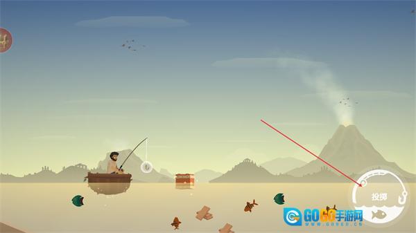 1、操控角色在船上钓鱼,点击投掷按钮抛竿,尝试钓取水中的鱼或物品,推进生存流程。