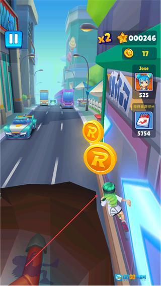 1、操控角色飞檐走壁,避开车辆障碍的同时收集墙面旁的金币,持续推进。