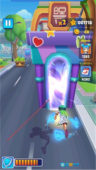 3、冲向紫色传送门,触发传送效果,同时利用护盾道具抵御可能的伤害。