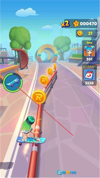 4、持续操控滑板滑行,收集沿途金币,利用滑板效果快速通过当前区域。