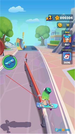3、借助滑板在栏杆上滑行,保持平衡的同时收集栏杆旁的金币,推进跑酷进度。
