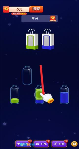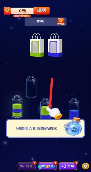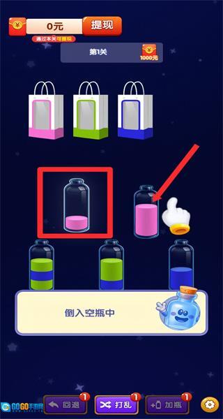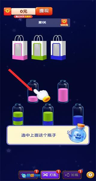 1、进入关卡后,按照指引点击目标瓶子,完成选中瓶子的基础操作,开启液体分装的解谜流程。