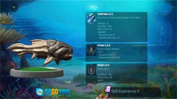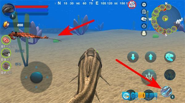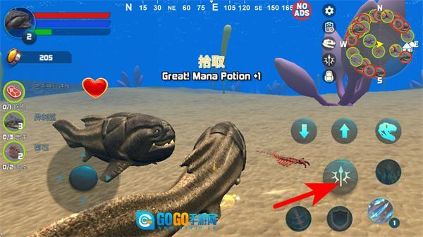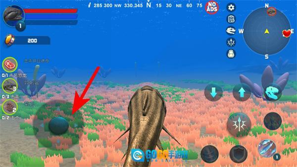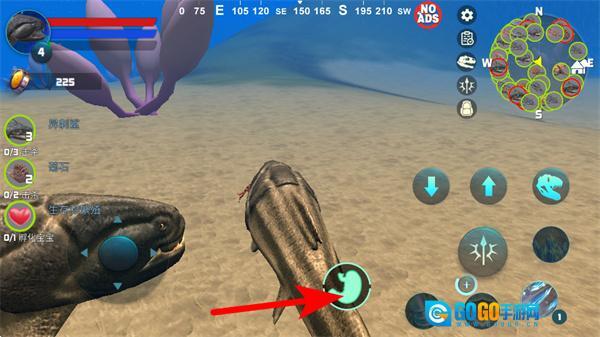 1、进入游戏后,点击左下角操控鱼类角色移动到目标资源,完成资源的拾取操作,积累初始物资。