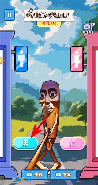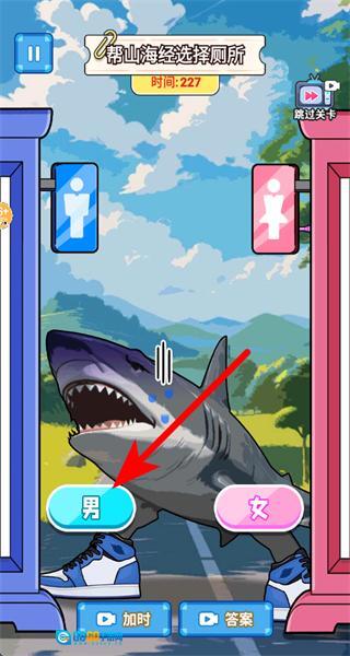 2、当关卡中出现鲨鱼形象的山海经角色时,点击下方的男按钮,完成厕所分类选择。