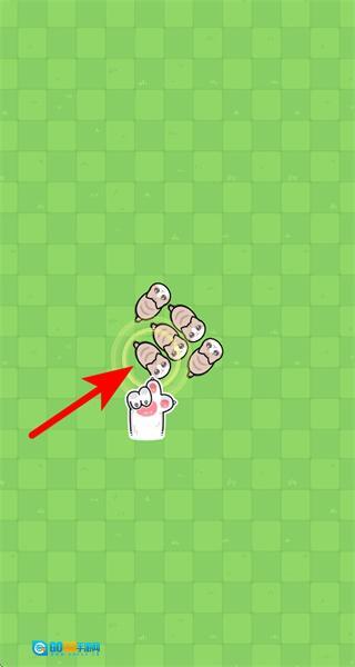 1、进入关卡后,点击目标区域带黑煤球的木板,触发小生物的移动与合并操作。
