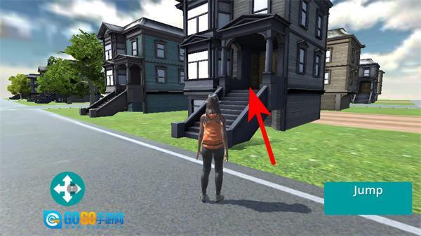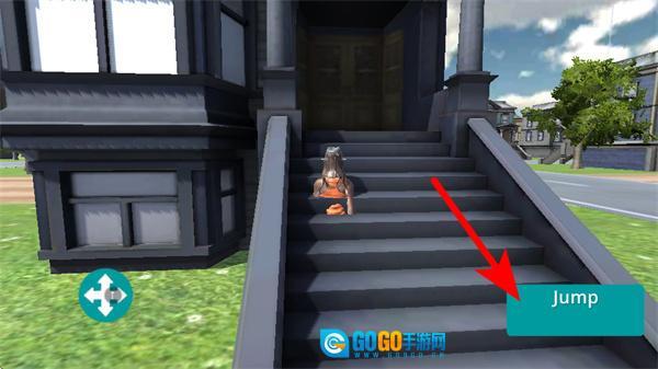 4、点击右侧的Jump按钮,操控角色跳跃上台阶,进入建筑区域完成该阶段的探索目标。