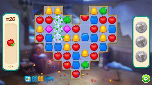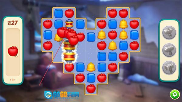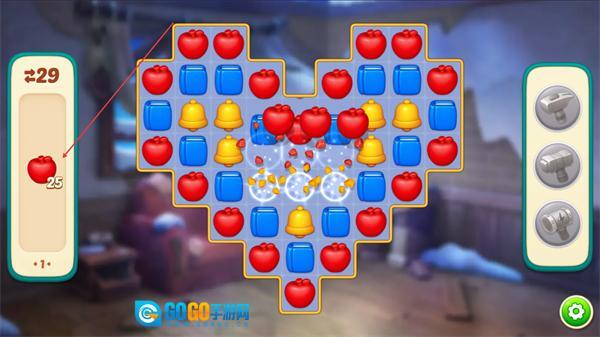 2、消除相同图案如红色苹果,积累左侧进度条的数值,推进关卡。