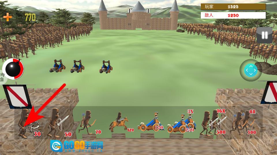 点击开始游戏进入关卡选择界面,选择第一关开启挑战,右侧遥感控制镜头移动,左侧炸弹准备好后点击选中再点击敌方区域即可引爆,点击底部兵种再点击战场完成部署,注意左侧金币剩余量,合理召唤刀斧手、盾兵等兵种作战。