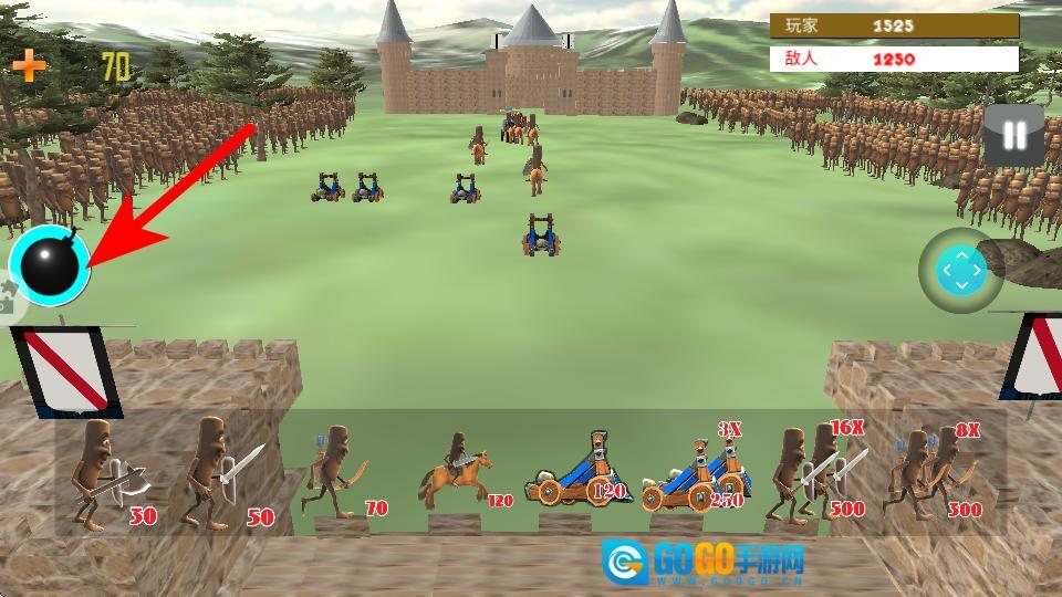 3、点击左侧的炸弹道具,对敌方军团发起范围攻击,削弱敌方兵力优势。