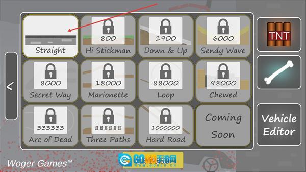 1、在关卡选择界面,初始可选择解锁的Straight关卡进入,其他关卡如HiStickman等需积累对应数量的货币解锁,也可通过VehicleEditor自定义载具。