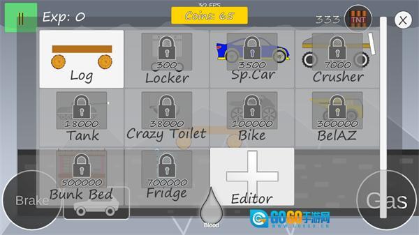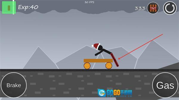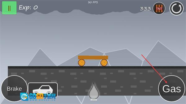2、进入关卡后,点击Gas按钮控制载具前进,同时关注下方的Blood状态条,避免载具受损导致状态条耗尽,可配合Brake按钮调整速度。