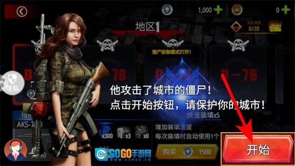 1、在启动界面点击开始按钮,进入城市防僵尸的射击关卡,开启战斗流程。