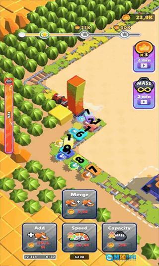 合并相同等级火车与锯子实现高效升级,火车可成长为强大立方体机车提升运力,锯子合并后能提高砍伐速度,助力快速开采资源、扩展铁路。