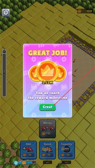 2、达成奖励里程碑后,点击Great领取3.53M金币奖励,继续游戏。