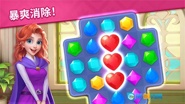 游戏采用滑动交换宝石的操作方式,消除规则简单明了,搭配新手引导能让玩家快速熟悉玩法,无需复杂学习,轻松体验消除与装修的双重乐趣。