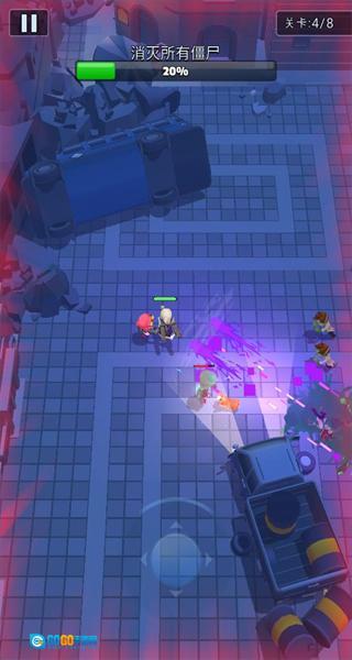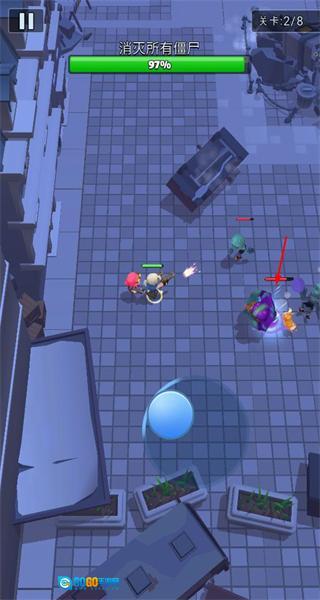 2、操控角色攻击丧尸,消灭敌方单位以推进关卡进度,积累战斗资源与进度值。