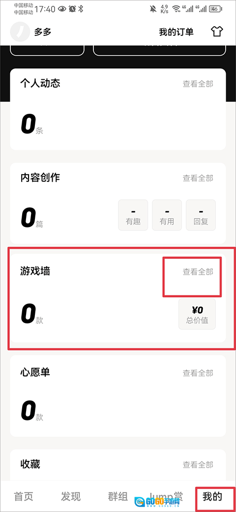 1、在个人界面中找到游戏墙功能,点击查看全部