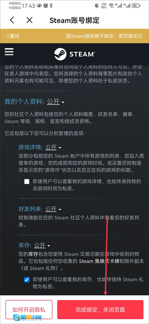 3、登录Steam账号后,点击完成绑定,然后关闭页面