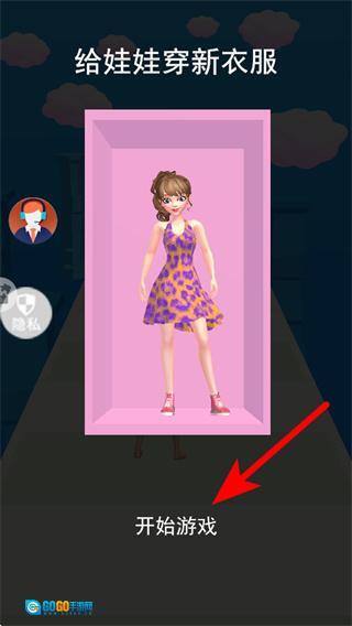 1、在启动界面点击开始游戏按钮,进入给娃娃穿新衣服的装扮闯关场景,开启换装冒险。