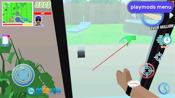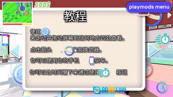 3、进入游戏场景后,按照指引接触场景中的物品,同时可使用右侧的慢动作功能辅助操作,积累如300$的资源推进游戏。