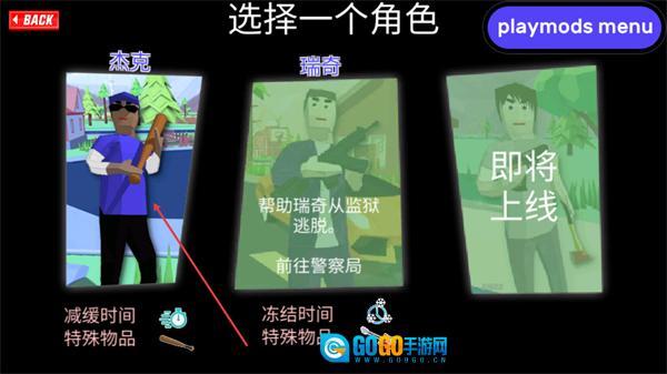 2、在角色选择界面,可挑选杰克进行游戏,该角色拥有减缓时间的特殊能力与棒球棒类特殊物品,不同角色对应不同玩法。