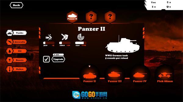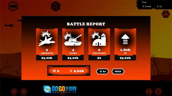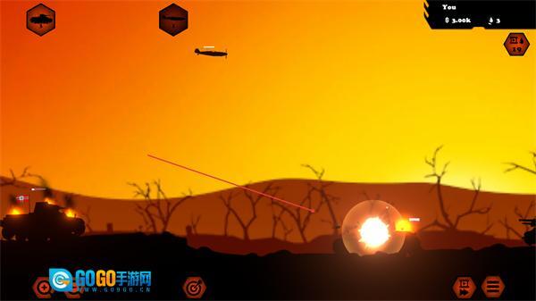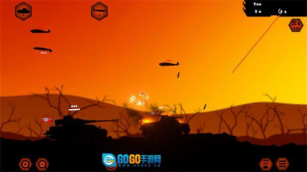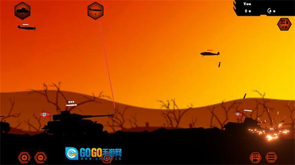 1、在战场中操控坦克,瞄准敌方坦克与空中单位,发射炮弹发起攻击,推进战局。