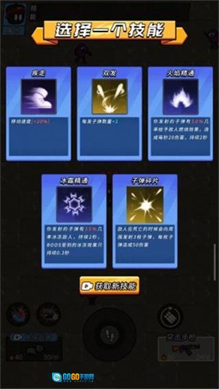 技能库丰富多元,包含移速提升、多发子弹、元素攻击、召唤物、范围爆炸等多种类型。升级过程中技能会随机刷新,玩家可自由组合搭配,从而打造出独一无二的战斗流派。