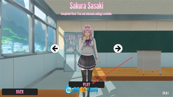 2、进入角色选择界面,当前角色是SakuraSasaki,已解锁真结局与分支结局,点击PLAY按钮即可进入该角色对应的剧情关卡,开启互动流程。
