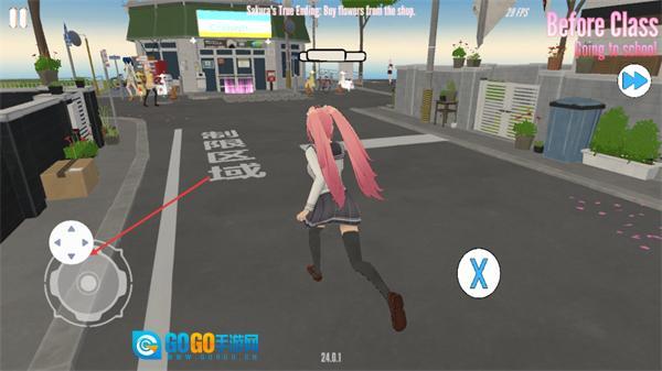 4、在Goingtoschool的户外场景中,通过左侧方向键控制角色移动,目标是前往商店完成Buyflowers的结局任务,按界面提示推进即可完成对应剧情。