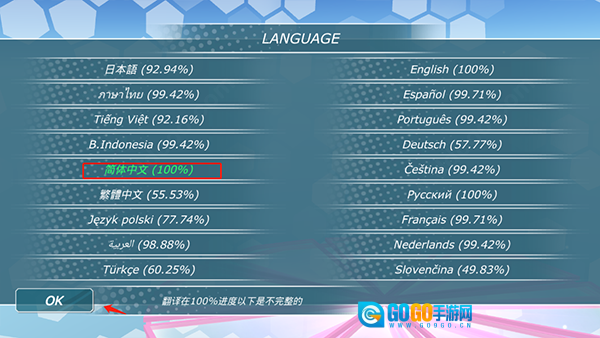 3. 在弹出的语言列表里,找到并勾选【简体中文(100%)】这一项,接着点击【OK】按钮确认选择。