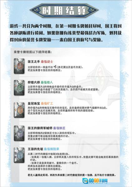 4.阶段结算:游戏设置两个阶段。第一阶段结束后,国王会检阅所有部队,麾下军队战力最突出的玩家可赢得荣誉卡牌奖励。第二阶段结束时,国王将对所有军队的勇气值展开最终统计!不同职业有着专属的计分规则,英雄与时代称号还能为你的军队助力加成。究竟谁能成为矮人王手下的最强军队,让我们拭目以待!